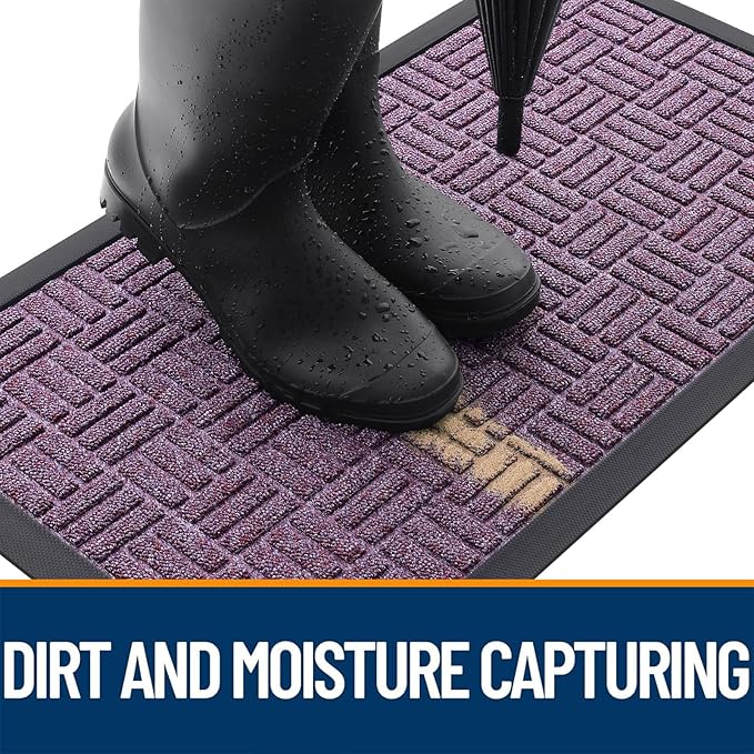 - [CAPTURES DIRT AND MOISTURE] The surface of the OLANLY door mat is made of woven polyester fabric featuring deep grooves to effectively trap dust, mud, and debris. The sturdy, beveled rubber edge prevents water pooling, ensuring a dry, clean entrance even in rainy or snowy conditions.