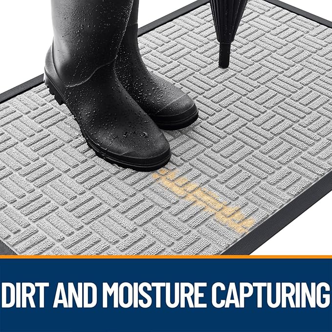 - [CAPTURES DIRT AND MOISTURE] The surface of the OLANLY door mat is made of woven polyester fabric featuring deep grooves to effectively trap dust, mud, and debris. The sturdy, beveled rubber edge prevents water pooling, ensuring a dry, clean entrance even in rainy or snowy conditions.