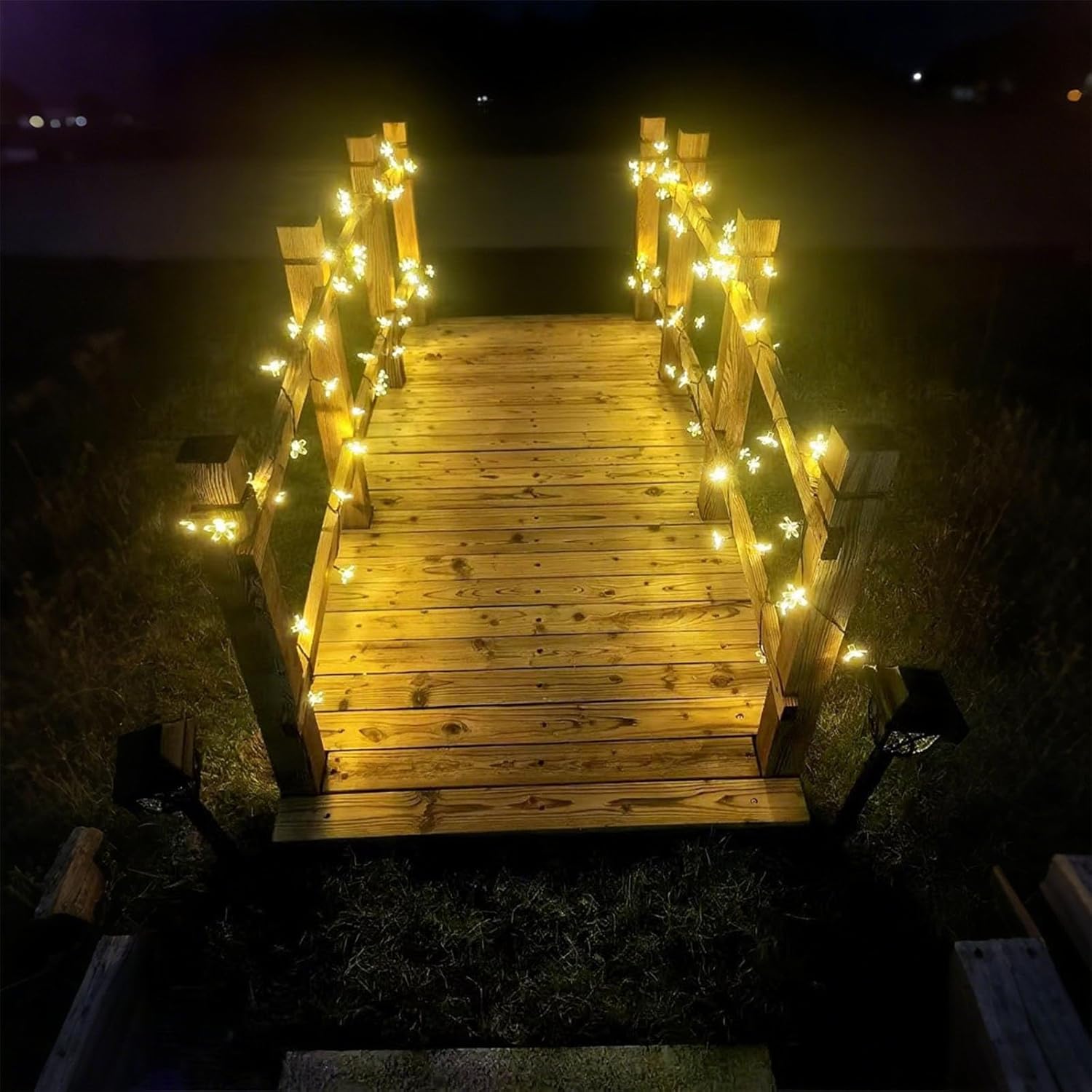 - Waterproof Outdoor Solar Lights: Total length is 23 feet (16.4ft lighting length, 6.6ft lead length) , 50 LED cherry blossom shaped bulbs. IP65 waterproof, it can withstand bad weather. Enjoy the view even when it's raining.