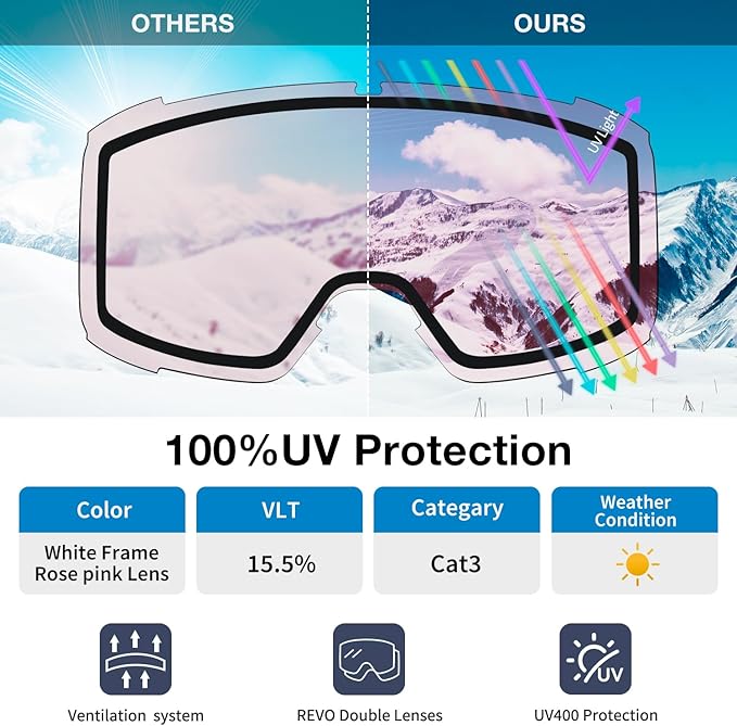 - 【Fog Free Vision & UV400 Protection】Ski goggles feature high-performance dual-layer lenses. Inner layer: long-lasting anti-fog for clarity. Specially treated outer layer: ultra-hard, scratch/impact resistant. Adapts to rapid changes in light intensity in snowy environments.