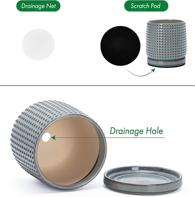 - Drainage Hole & Matching Saucer: Each pot comes with pre-drilled drainage hole and perfectly matching ceramic design tray for small amount of excessive water drain.