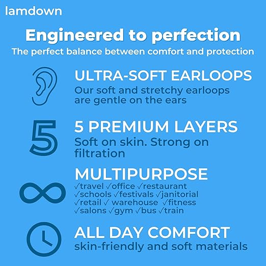 - 5‑Layer Superior Protection: Lamdown KN95 masks feature two non‑woven outer layers, two high‑efficiency melt‑blown filters, and a soft hot‑air cotton inner layer. This advanced design delivers ≥ 95% filtration of fine particles, offering greater protection than standard 3‑ply masks.