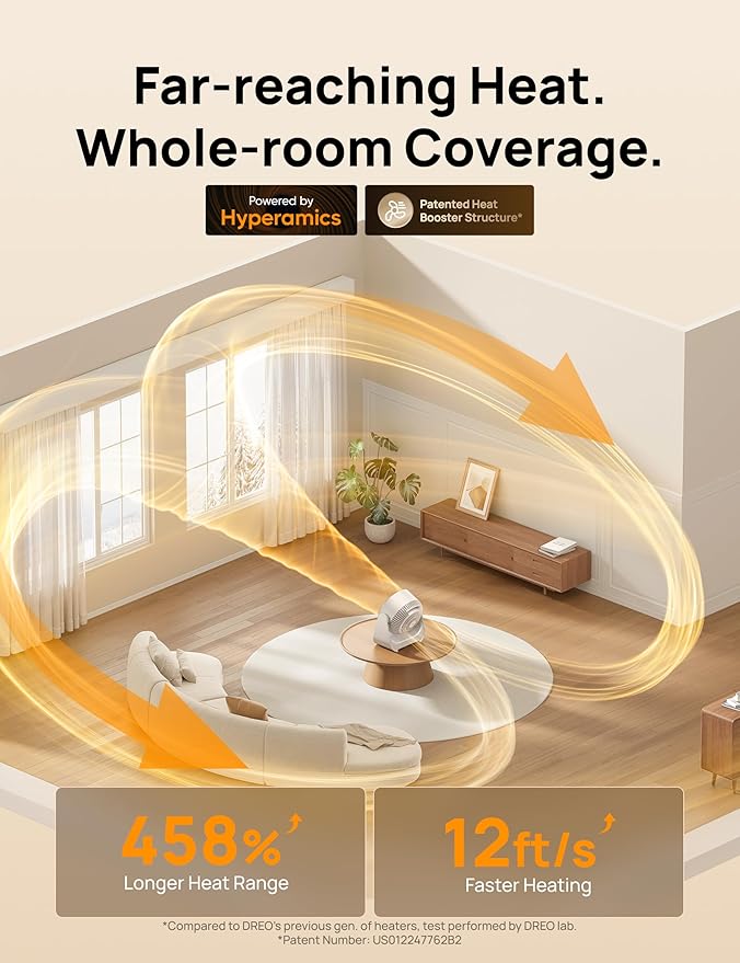 DREO 60ยฐ Vertical & 90ยฐ Horizontal 3D Oscillating Heating, 12 ft/s Long-Range Circulator, 3 Heat & 3 Fan Settings, Space Heaters for Indoor Use, Bedroom, Office, White