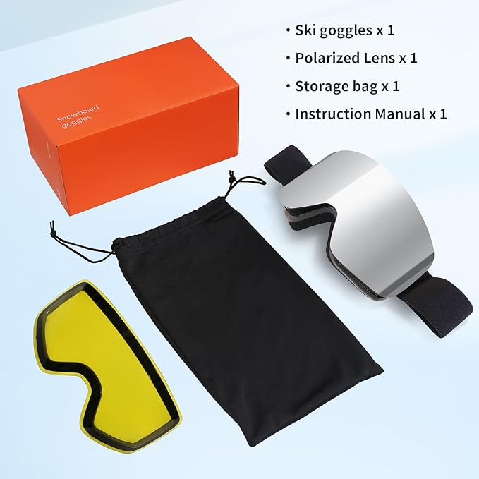 - Full REVO Lens Coating Design & UV400: You will receive 1 x ski goggles, 1 x carrying pouch and 1 x instruction manual. The adult ski goggles with full REVO lens coating can provide an outstanding clear field of vision. Our snow goggles feature UV400 lenses that can block uv rays and protect your eyes from long-term damage.