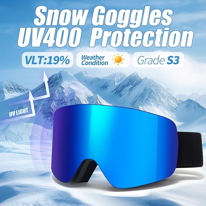 - Full REVO Lens Coating Design & UV400: You will receive 1 x ski goggles, 1 x carrying pouch and 1 x instruction manual. The adult ski goggles with full REVO lens coating can provide an outstanding clear field of vision. Our snow goggles feature UV400 lenses that can block uv rays and protect your eyes from long-term damage.