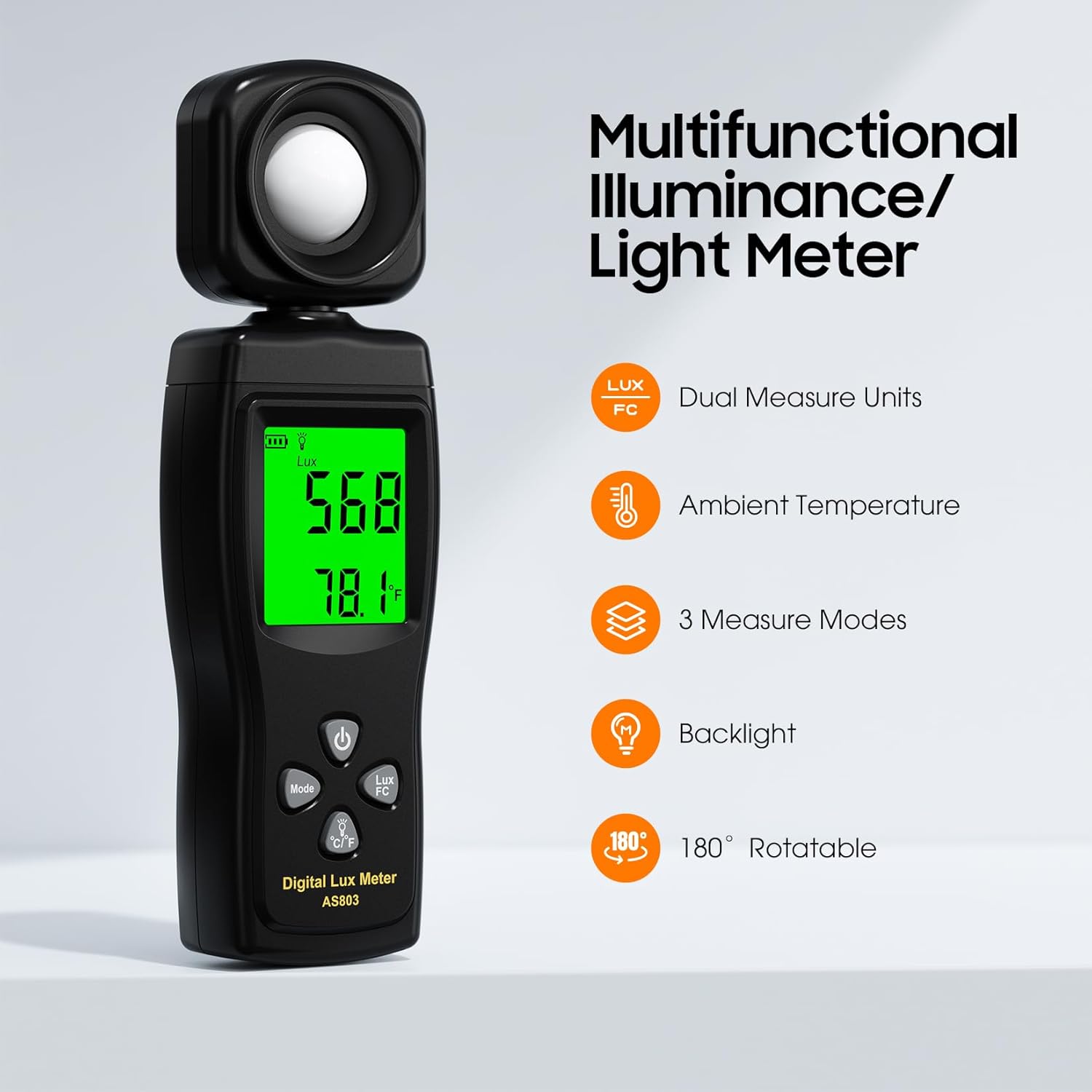 - 【180° Rotating Sensor & Clear Backlist Display】Ohcans AS803 light meter features a 180° rotating sensor for flexible measurements from any angle. The backlight LCD ensures clear reading even in low light. With rapid 0.5-second sampling, it delivers real-time data perfect for photography lighting setups, office evaluations, and monitoring indoor plant growth