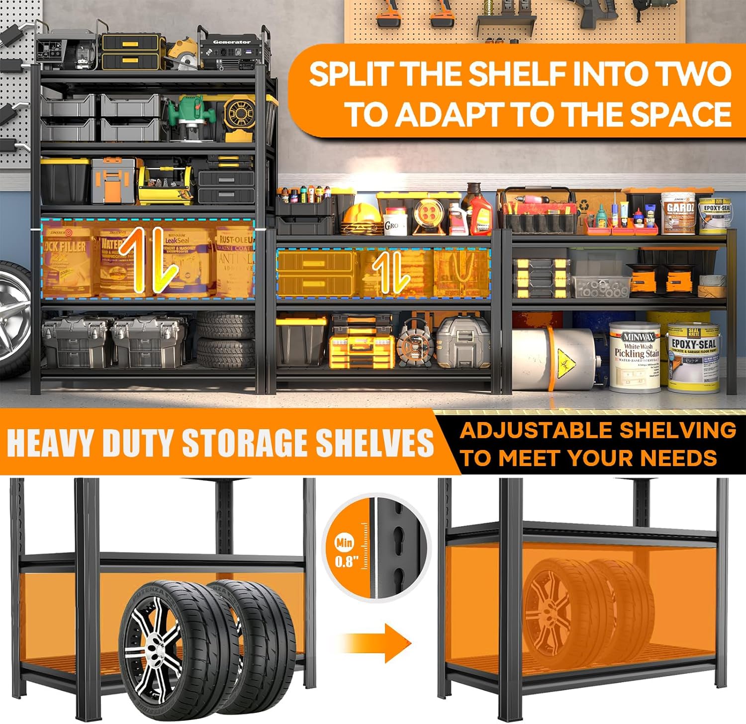 - Adjustable and Detachable Metal Garage Shelves: The metal garage shelf features freely adjustable height, allowing it to accommodate items of varying sizes. This flexibility adapts seamlessly to diverse storage scenarios, helping you maximize space utilization. What's more, the garage shelving unit can be split into two separate shelves, catering to your different needs and providing a versatile storage solution