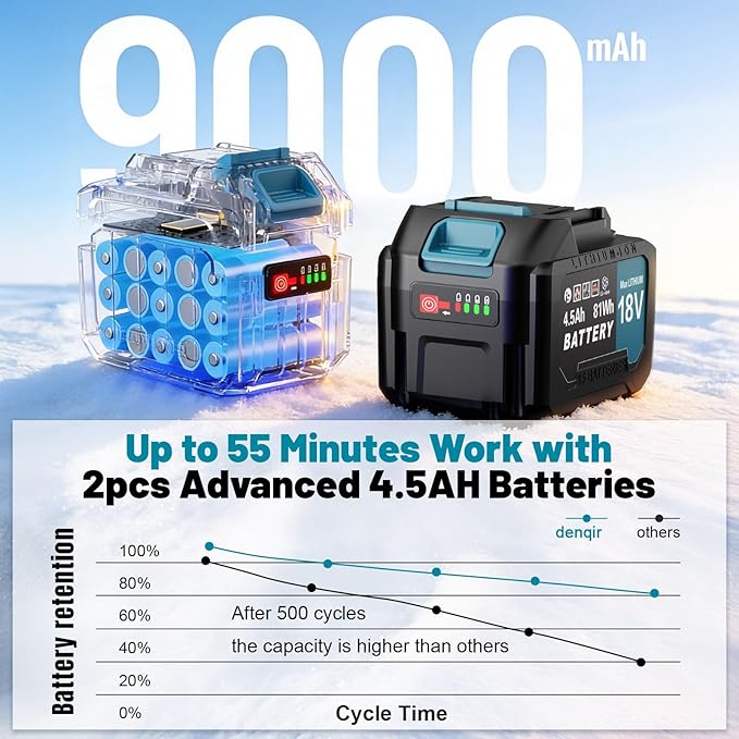 - 【Long-Lasting Battery Performance】This battery snow blower features 2pcs 4500 mAh lithium-ion batteries and quick charger. A full charge of both 2 batteries provides 55-65 minutes of load runtime, ensuring non-stop use, enough to clear snow around your home in a single charge. and battery operated snow shovel builts for harsh winters, battery powered snow blower delivers reliable performance even in extreme cold down to -20°C (-4°F)
