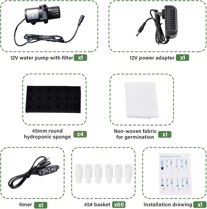 - Complete Indoor Hydroponic Gardening Kit – Includes 12 V water pump, power adapter, cultivating sponges, germination cloth, custom baskets, installation guide, and water-level gauge, giving you everything required to start a productive hydroponic planter system immediately.