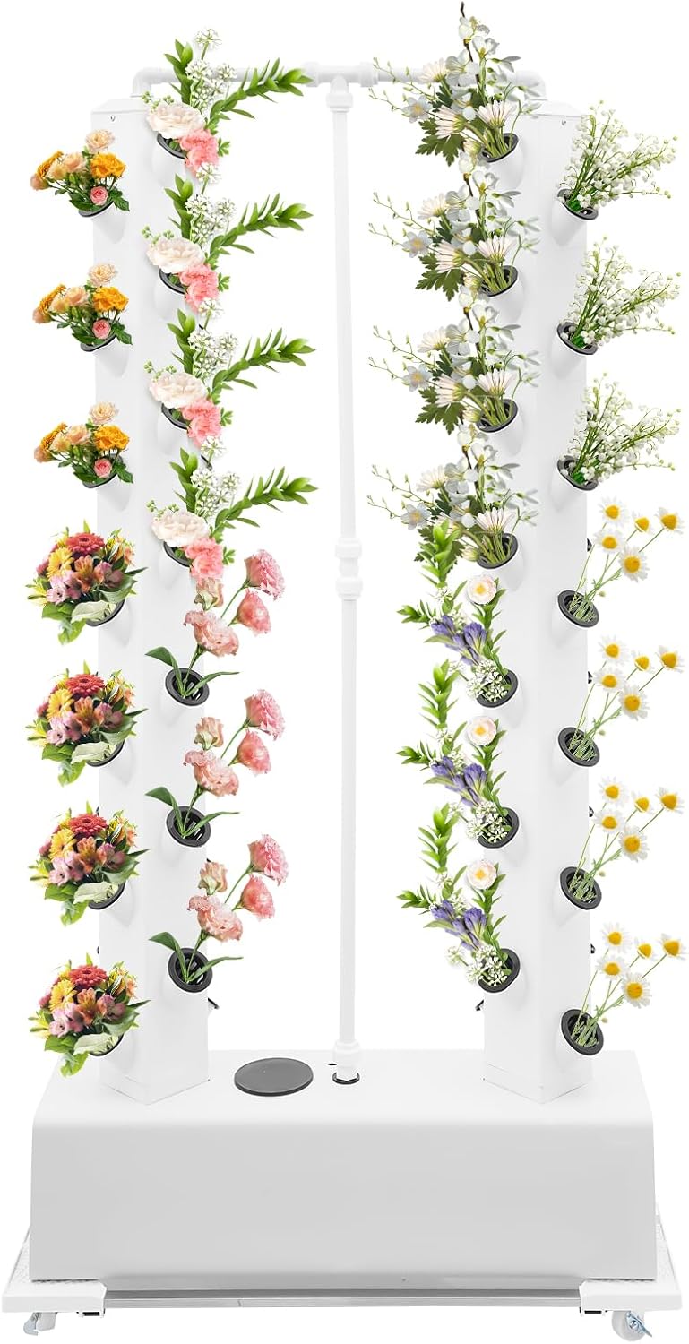 - 【SUPERIOR GROWTH EFFICIENCY & HIGH YIELD】Features a two-tier design with 56 planting sites and large-hole baskets for optimal root expansion, promoting robust growth and maximizing harvest of herbs, vegetables, and fruits like tomatoes, strawberries, and lettuce. The top-down circulation and vertical tower structure enhance oxygen flow to roots, accelerating growth while saving water through targeted irrigation.