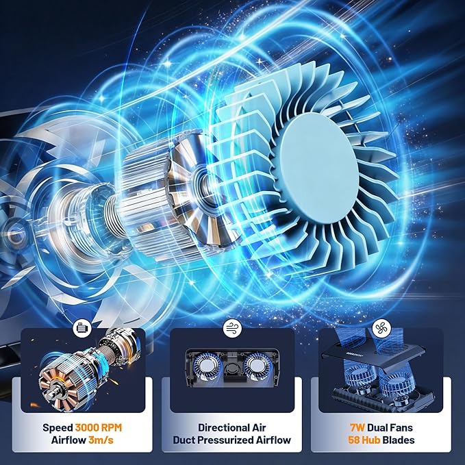 - 【A New Cooling Choice】Compared to a chillers, this cooling fan offers a more economical and flexible cooling alternative.with 58 high-density blades and a dual-turbine system.It concentrated airflow to deliver powerful,focused wind at up to 3600 RPM.The brushless motor reduces noise to just 35 dB,quieter than ordinary Fans.It causes no disturbance even during nighttime use, ensuring a peaceful home environment.