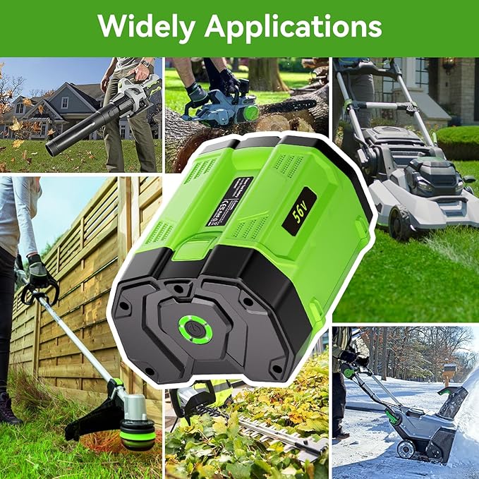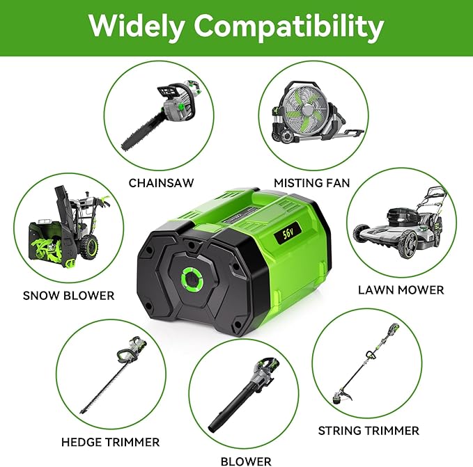 - 【Safe & Reliable Performance】 As a reliable replacement for the EGO 56V battery, it comes with FCC, CE, and RoHS certifications. The integrated smart chip and multi-protection system safeguard against over-charging, over-discharging, over-current, and over-heating for completely safe operation.