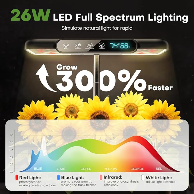 - Adjustable Height & Automatic Timer : indoor gardening system accommodate plants at every stage with the extendable light post, adjustable across 4 sections up to 15.4 inches. Combined with 16H (Vegetables) and 22H (Fruits) timer modes, the full-spectrum plant grow light ensures year-round gardening. This indoor gardening system mimics sunlight to promote faster growth, Compared to soil cultivation, planting efficiency increases by 300%.