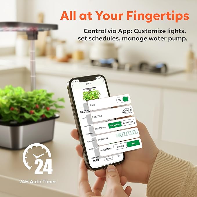 - Effortless Smart App & User-Friendly: Set up your hydroponic growing system in minutes with easy-to-follow manuals and app guides. Our garden kit indoor uses the Smart Life App, which can: adjust the 24-hour light cycle/ automatic timer (default: 16H on/ 8H off), track growth days, and maintain perfect conditions. Nurture vibrant plants effortlessly and enjoy homegrown harvests. This indoor garden is designed for easy use, suitable for all ages.