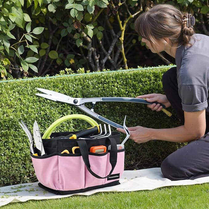 Housolution Gardening Tote Bag, Deluxe Garden Tool Storage Bag and Home Organizer with Pockets, Wear-Resistant & Reusable, 14 Inch, Pink