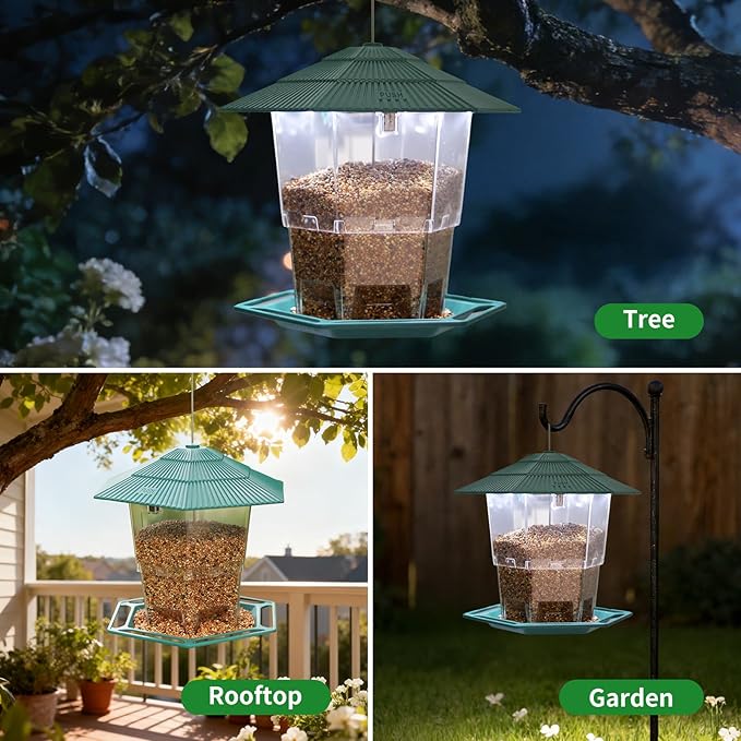 - Easy to Use: Designed for convenience, this bird feeder features a simple push-button lid. Just press the button on the top to open the cover and easily refill bird food—no tools or complicated steps needed. Quick, clean, and hassle-free feeding every time.